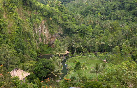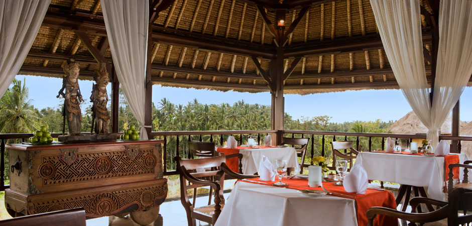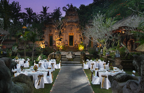 Położenie: Usytuowany jest w cichej i zielonej okolicy miasteczka Ubud, które oddalone jest od hotelu zaledwie 10 min drogi autem. Do Międzynarodowego lotniska Denpasar Ngurah Rai można dojechać w godzinę. Hotel położony jest nad rzeką Petanu, otoczony jest lasem tropikalnym oraz tarasami ryżowymi.
