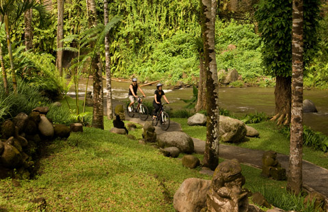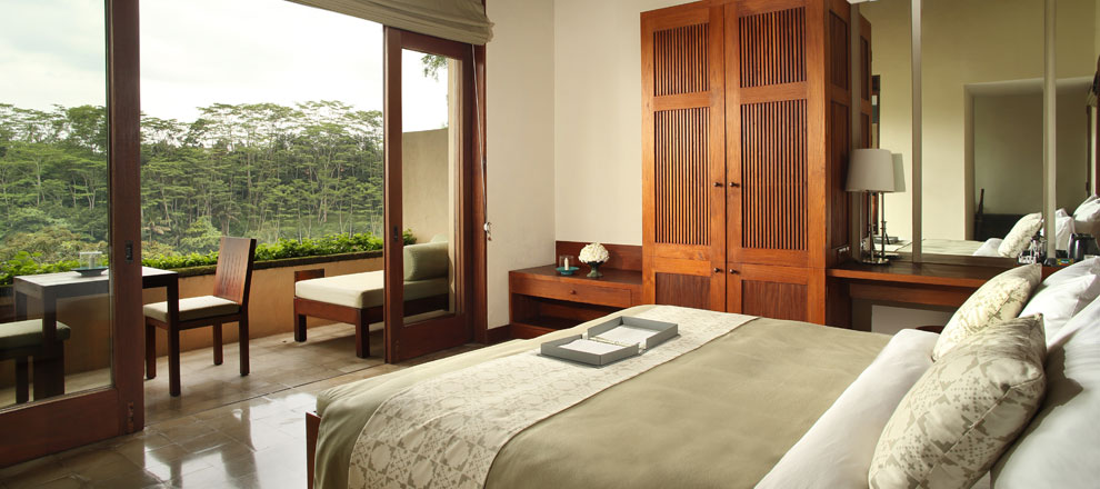 Pokoje: łączą w sobie nowoczesne i tradycyjne balijskie elementy. Duży balkon z widokiem na okoliczne wzgórza i rzekę uzupełnia 35 m² wnętrze, którego wyposażenie to: klimatyzacja, telefon, sejf, zestaw do kawy i herbaty, minibar, stacja dokująca do iPoda, żelazko, część wypoczynkowa. W łazience prysznic, wanna, suszarka do włosów, szlafrok, zestaw kosmetyków, kapcie.
