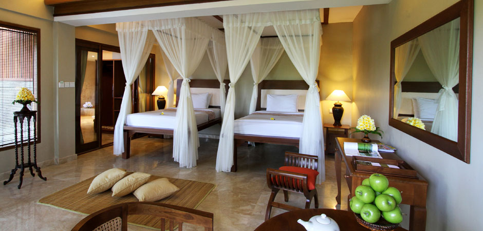 Pokoje: Hotel w swojej ofercie przygotował szeroki wybór zakwaterowania. Zaczynając od standardowej wilii z basenem, a kończąc na, dodatkowo płatnych, willach z jacuzzi, piętrowych apartamentach oraz prywatnym domu. Standardowa willa ma powierzchnię 300 m2 i zaprojektowana jest w balijskim stylu z wydzielonym osobnym salonem z zachwycającym widokiem. Wyposażenie obejmuje TV, łazienkę z wanną i prysznicem urządzoną w stylu SPA, lodówkę, zestaw do parzenia kawy, jadalnię, leżaki przy prywatnym basenie.