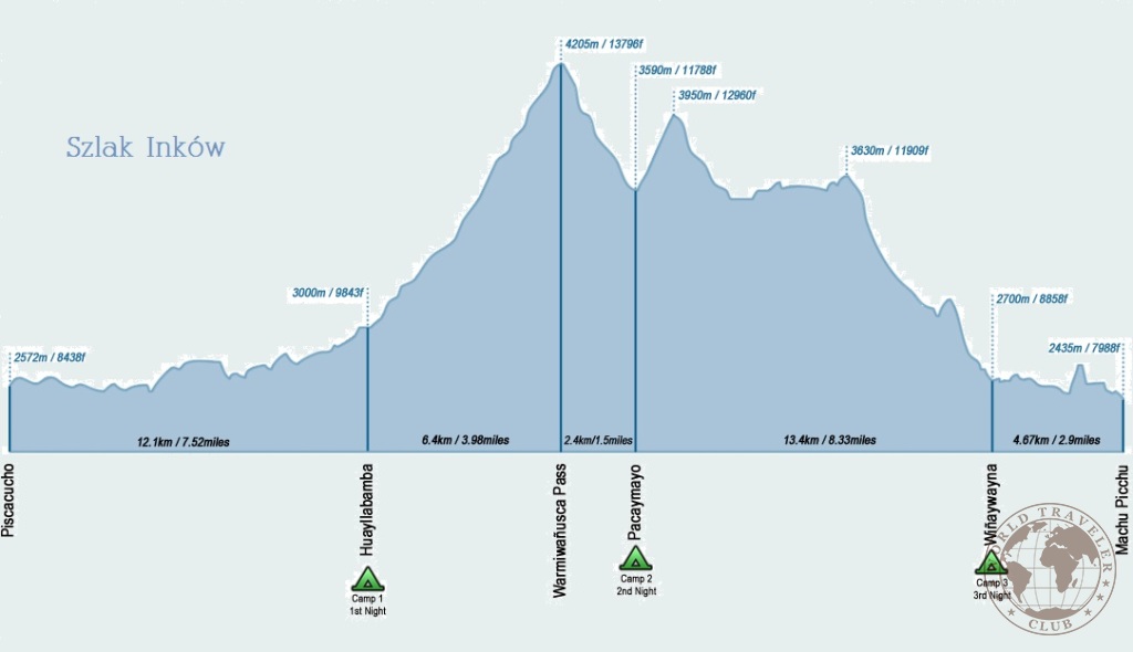 Godziny przejścia są szacunkowe. Miejsca noclegu mogą ulec zmianie.Co zabrać:- Śpiwór (można wypożyczyć w Cuzco)- Plecak z ubraniami na zmianę na cały trekking- Płaszcz przeciwdeszczowy (lub kurtka i spodnie) lub plastikowe poncho (można kupić w Cusco)- Mocne, sprawdzone buty trekkingowe (zalecane wodoodporne)- Ciepłe ubrania, w tym kurtki. Odzież termiczna jest również zalecana, zwłaszcza do spania- Karimata: dostarczana przez agencję, ale noszona samodzielnie- Latarkę i baterie- Kapelusz lub czapkę z daszkiem do ochrony przed słońcem, deszczem i zimnem- Krem z wysokim filtrem UV- Środek przeciwko owadom - minimalne zalecenie 20% DEET – (na trasie nie ma ryzyka malarii)- Przekąski: ciastka, batony energetyczne, czekolada, suszone owoce, muesli, itp (na trasie codziennie rano wydawane są przekąski, posiłki serwowane 3 razy dziennie są kompletne, jednak polecamy zabranie ulubionych przekąsek, które mogą być niedostępne)- Woda na pierwszy ranek.- Opcjonalnie: tabletki do sterylizacji wody ze strumieni i rzek na trasie. Codziennie dostarczana jest przegotowana woda, która jest zdatna do picia i nie powoduje żadnych problemów zdrowotnych (przynajmniej do tej pory :-) )- Paszport- Opcjonalnie: kijki trekkingowe z gumowymi osłonami (osłonki są obowiązkowe, by nie uszkodzić szlaku) -