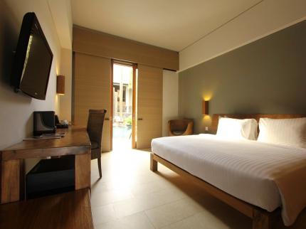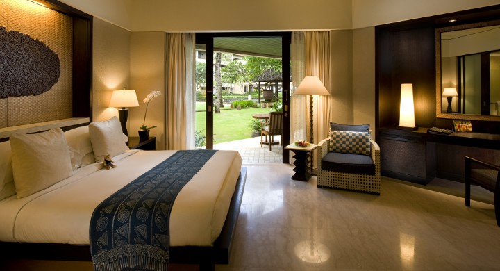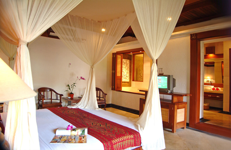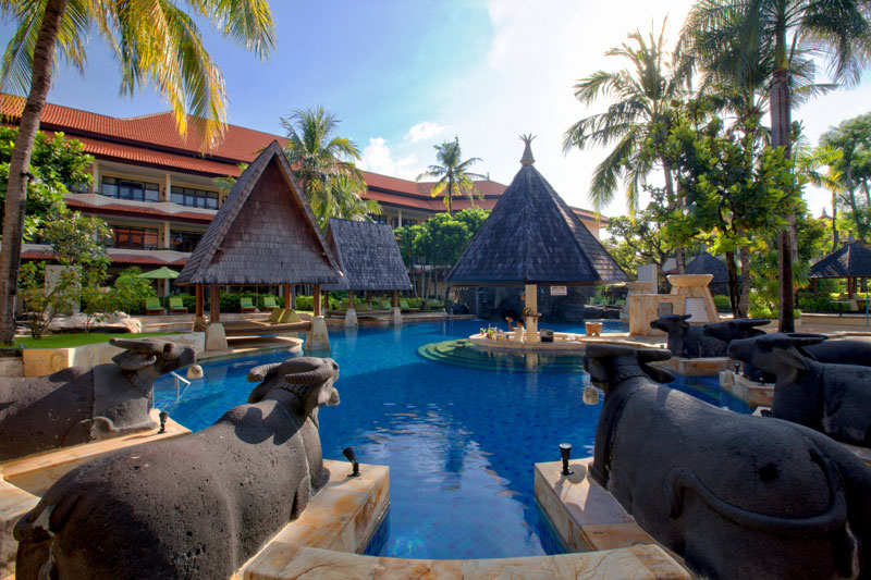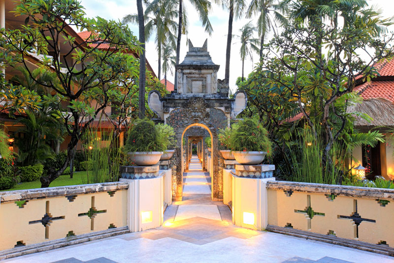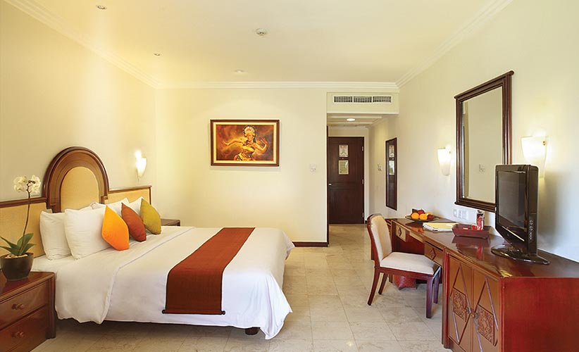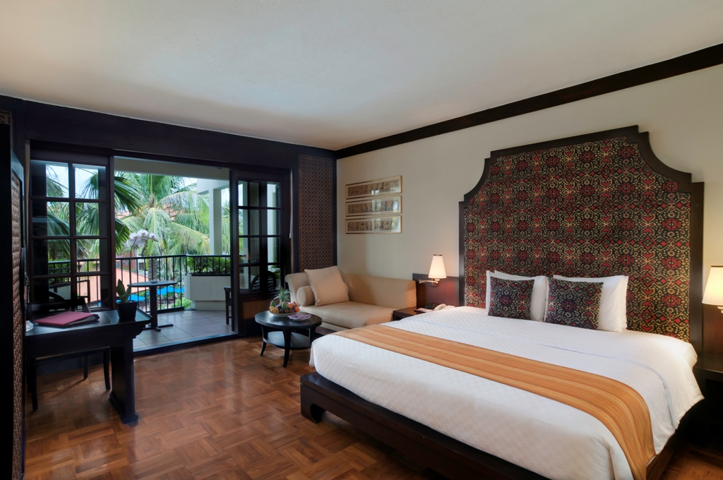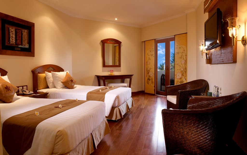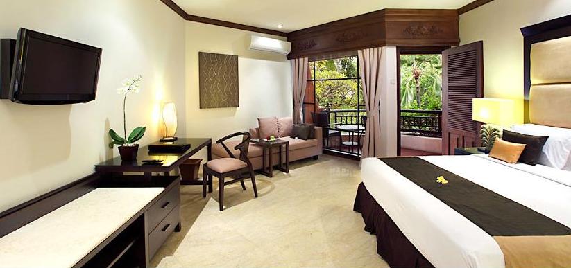 Duch Bali przeniknie Państwa już w momencie przekroczenia progu hotelu, wraz odgłosem gongu świętującego Państwa przybycie.Pokoje: Hotelowe pokoje zostały zaprojektowane specjalnie by relaksować po pełnym zabawy i emocji dniu. Lśniące drewniane podłogi i panele, uzupełnione ciepłymi odcieniami błękitu i zieleni mebli, składają się na przytulne wnętrza. Z okien roztacza się widok na ukryte oczka wodne, rzeźby i piękne ogrody. Pokoje wyposażone są w klimatyzację, ekspres do kawy i herbaty, suszarkę, telewizję satelitarną, telefon oraz sejf. Marmurowa łazienka z osobnym prysznicem i wanną, jest w unikalny sposób oddzielona od sypialni drewnianymi żaluzjami.