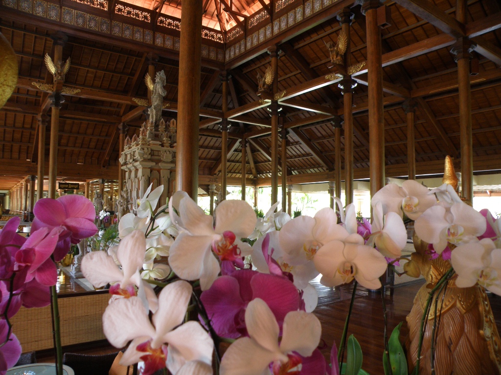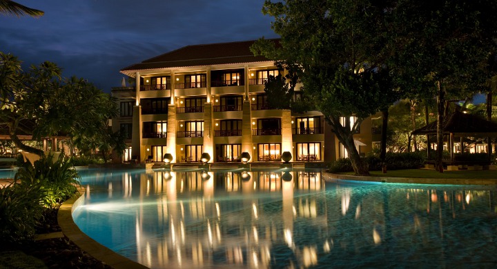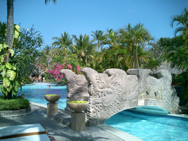 Ayodya BaliLokalizacja: Duży hotel, zbudowany na wzór balijskiego pałacu wodnego, usytuowany jest w pięknej okolicy na południu Bali, bezpośrednio przy wspaniałej plaży, wśród 11,5 ha ogrodów i otaczającej budynki hotelu laguny. Mimo wielu pokoi, dzięki dużej powierzchni i pięknie otaczającej architektury i krajobrazu, resort nie przytłacza. Hotel znajduje się w spokojnej, zielonej, pięknie utrzymanej miejscowości turystycznej Nusa Dua, 30km od centrum Denpasar i lotniska. W pobliżu znaleźć można kilka restauracji serwujących lokalne potrawy.