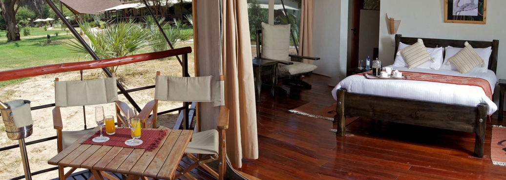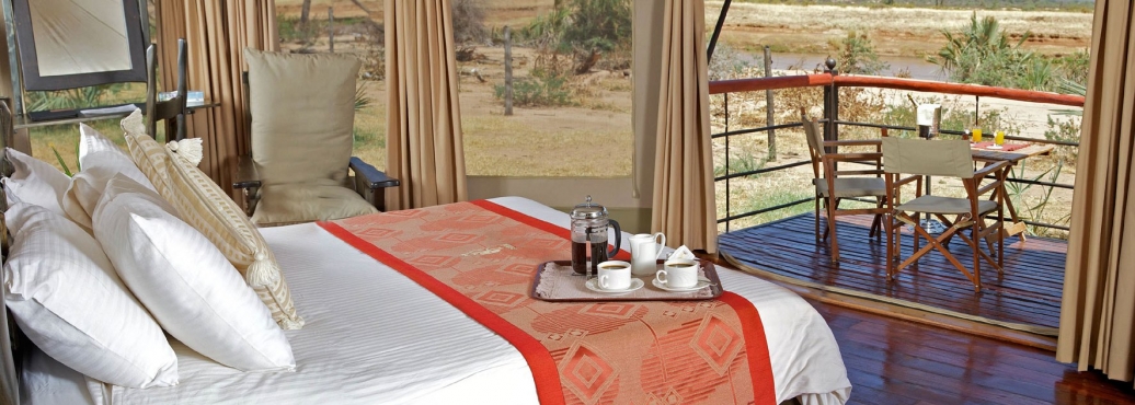 Pokoje: Lodge dysponuje 30 luksusowymi 2-osobowymi namiotami. Z namiotu rozpościera się widok na Rzekę Ewaso Nyiro. Przestrzeń w namiocie obejmuje garderobę, część wypoczynkową, miejsce na bagaż i sypialnię.