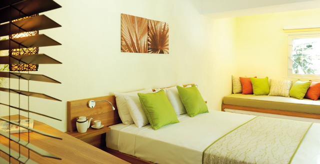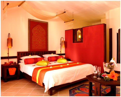 Pokoje: każdy pokój udekorowano ciepłymi kolorami, duże łóżko z baldachimem, przytulne i romantyczne wnętrza gwarantują udany wypoczynek, bez względu którą z trzech opcji zakwaterowania wybrano. 28 pokoi standardowych – superior, z klimatyzacją, telewizorem LCD 32” z kanałami telewizji satelitarnej, DVD, Mini-barem, sejfem, zestawem do kawy/herbaty, łączem internetowym i łazienką z prysznicem i suszarką, około 33 - 38 m². 29 pokoi przy plaży Deluxe wyposażenie dodatkowo obejmuje stację dokującą Ipod, ekspres Nespresso. 3 apartamenty, w tym apartament dla nowożeńców "Jasmine", z widokiem na morze (47 m²), oddalony od głównej części hotelu, z prywatną, romantyczną werandą z wygodnym, podwójnym leżakiem.